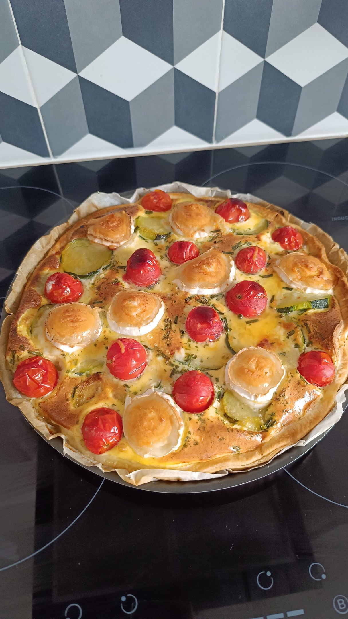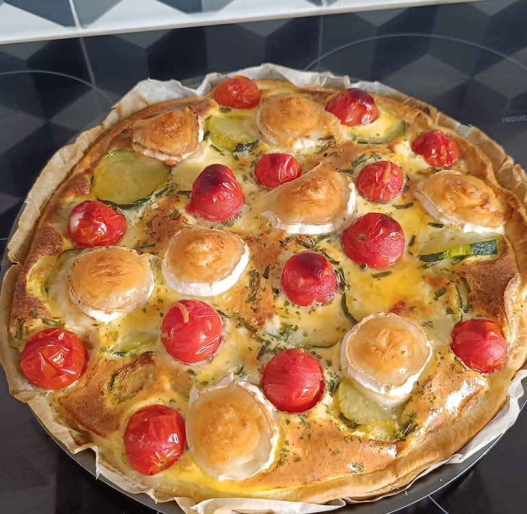 Etalez la pâte feuilletée ou brisée selon votre préférence dans le moule à tarte puis piquez la pâte à l'aide d'une fourchette. Faire revenir des rondelles de courgettes dans de l'huile puis après les avoir bien cuits et égouttés, les répartir dans le fond de la tarte. Coupez les tomates cerises en deux puis versez l'appareil à quiche dans le plat.